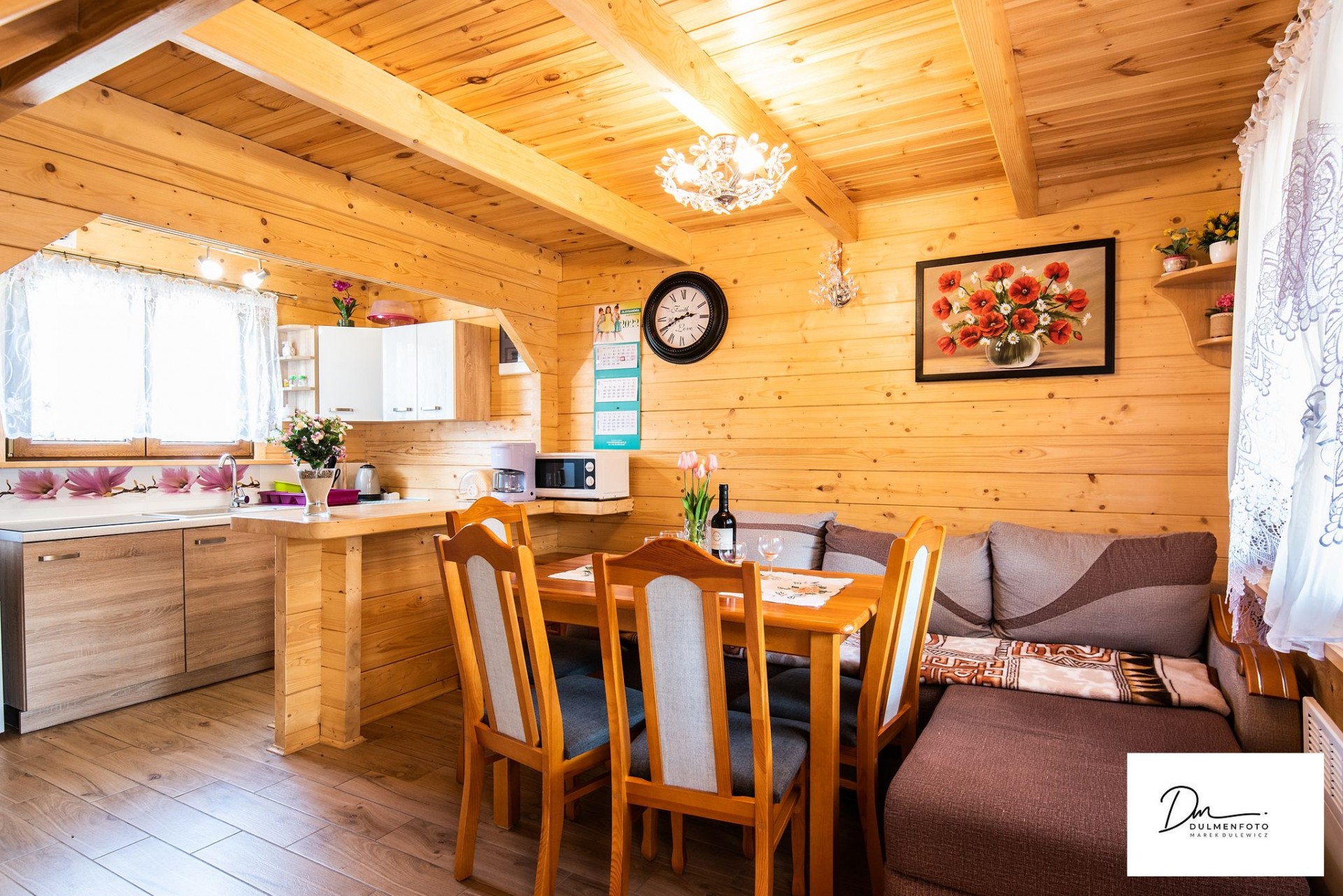 - Aneks kuchenny z pełnym wyposażeniem (kuchnia elektryczna, lodówka z zamrażalnikiem, mikrofalówka, toster, czajnik, ekspres do kawy, deska do prasowania)