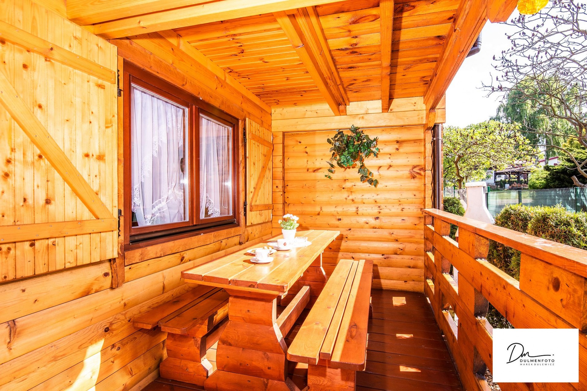- Taras z stołem i ławkami.