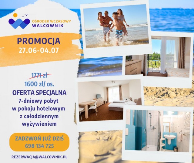Szukasz wypoczynku blisko morza? Ośrodek Wczasowy „Walcownik” w Sianożętach to miejsce oddalone od plaży o zaledwie 150 metrów. Ośrodek oferuje pobyt w komfortowych pokojach, domkach i apartamentach oraz pyszne domowe posiłki. Na ogrodzonym terenie ośrodka znajdą państwo dużo terenów zielonych, plac zabaw dla dzieci, świetlicę, stołówkę, miejsce na ognisko, wypożyczalnie rowerów, saunę, jacuzzi, bezprzewodowy Internet oraz parking. Zachęcamy do pobytów 7 i 14 dniowych zaczynających się w sobotę.